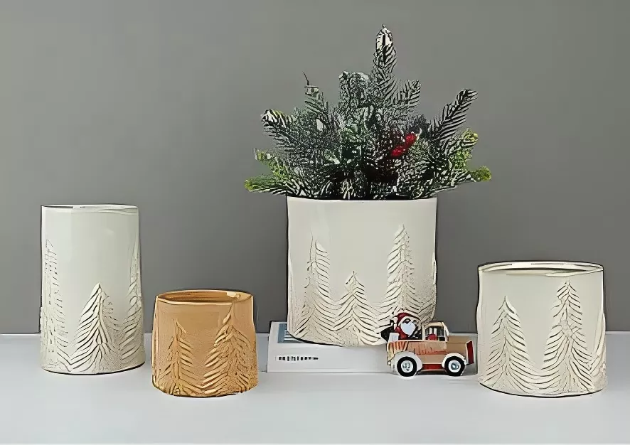 Reliefna božična vaza za bor uporablja klasičen vzorec borovega drevesa kot glavni element oblikovanja, ki predstavlja odpornost in dolgo življenjsko dobo, trajno temo za zimo in praznično sezono. Tehnika vtiskovanja ne samo poveča vizualno globino, ampak tudi vlije občutek ročno izdelane topline in umetniške zbirateljske vrednosti, ki daleč presega običajne plastične dekoracije. Poleg tega praktične oblike vključujejo klasične cilindrične, stabilne kvadratne podstavke in elegantne ovalne oblike, ki jih je mogoče uporabiti neodvisno kot umetniške predmete ali popolnoma prilagoditi rastlinam. Kot del serije izdelkov so ti cvetlični lonci, ki so na voljo v različnih velikostih in oblikah, lahko poljubno kombinirani in razporejeni (na primer v obliki pahljače ali v vrstah), da ustvarite večplastno in vizualno osupljivo namizno pokrajino.