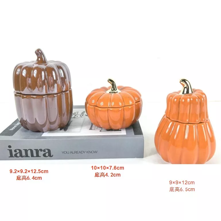 Halloween bučni keramični okraski: kozarci so realno in umetniško izdelani, da ponovijo bučni naravni odtenek. Kozarci so v temno rjavi in ​​svetlo oranžni barvi, ki posnemajo naravno barvo buče in imajo kovinski pokrov in gumb za rafiniran in privlačen zaključek.
