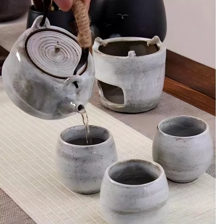 Ta tradicionalni čajni komplet vključuje čajnik in tri čajnice, poleg tega pa vključuje tudi keramično stojalo, ki bo lonec ogrel.